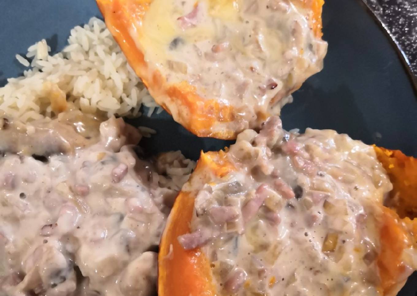 - Remettre le chapeau sur le potimarron et mettre au four pour 60 minutes. PS: Sur la photo vous pouvez voir que j'avais fait un peu de riz avec mais oubliez même pour les gros mangeurs un demi potimarron suffit amplement 😂.