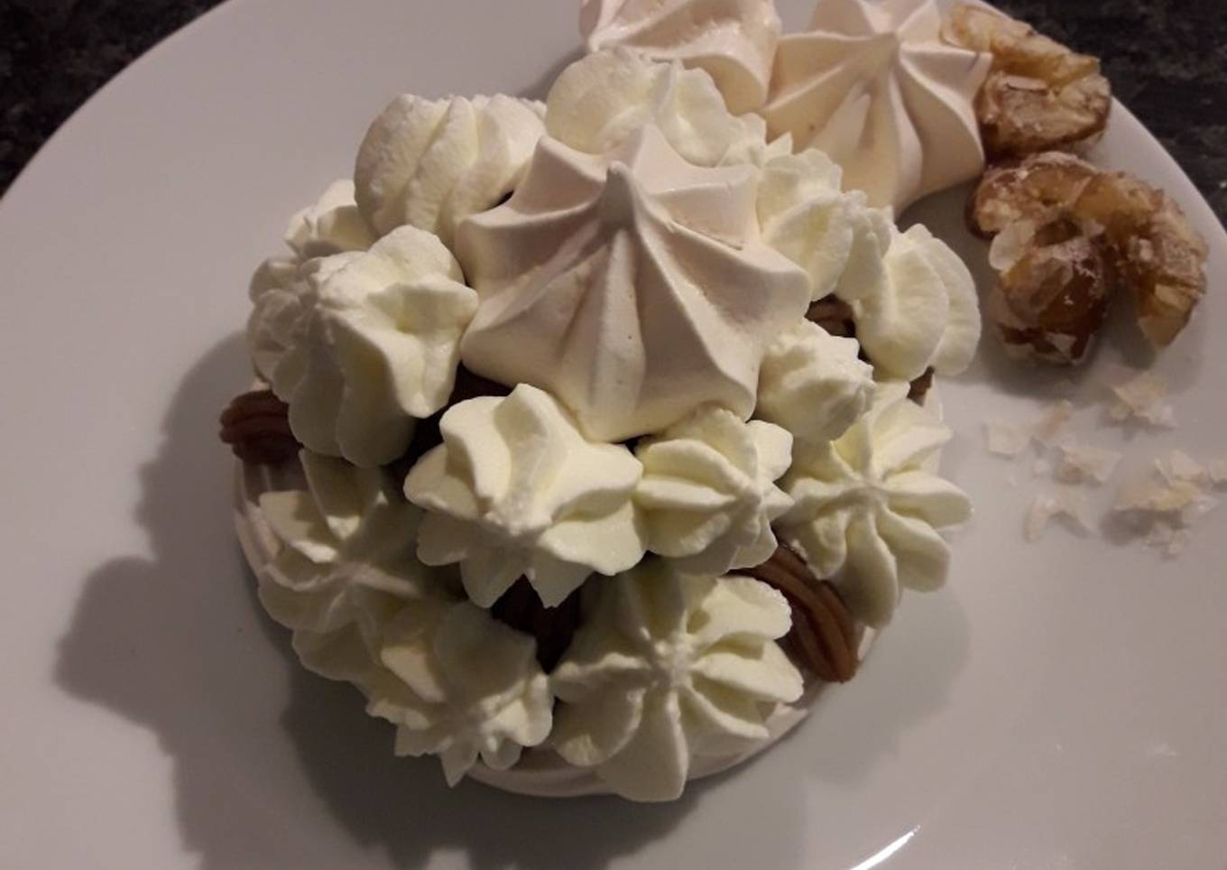 - Pour le montage, déposer un disque de meringue dans une assiette. Au centre faire un tas de crème de marron en faisant comme des spaghetti entortillés. Recouvrir avec des petits choux de crème chantilly et décorer avec des petites meringues et des brisures de marrons glacés.