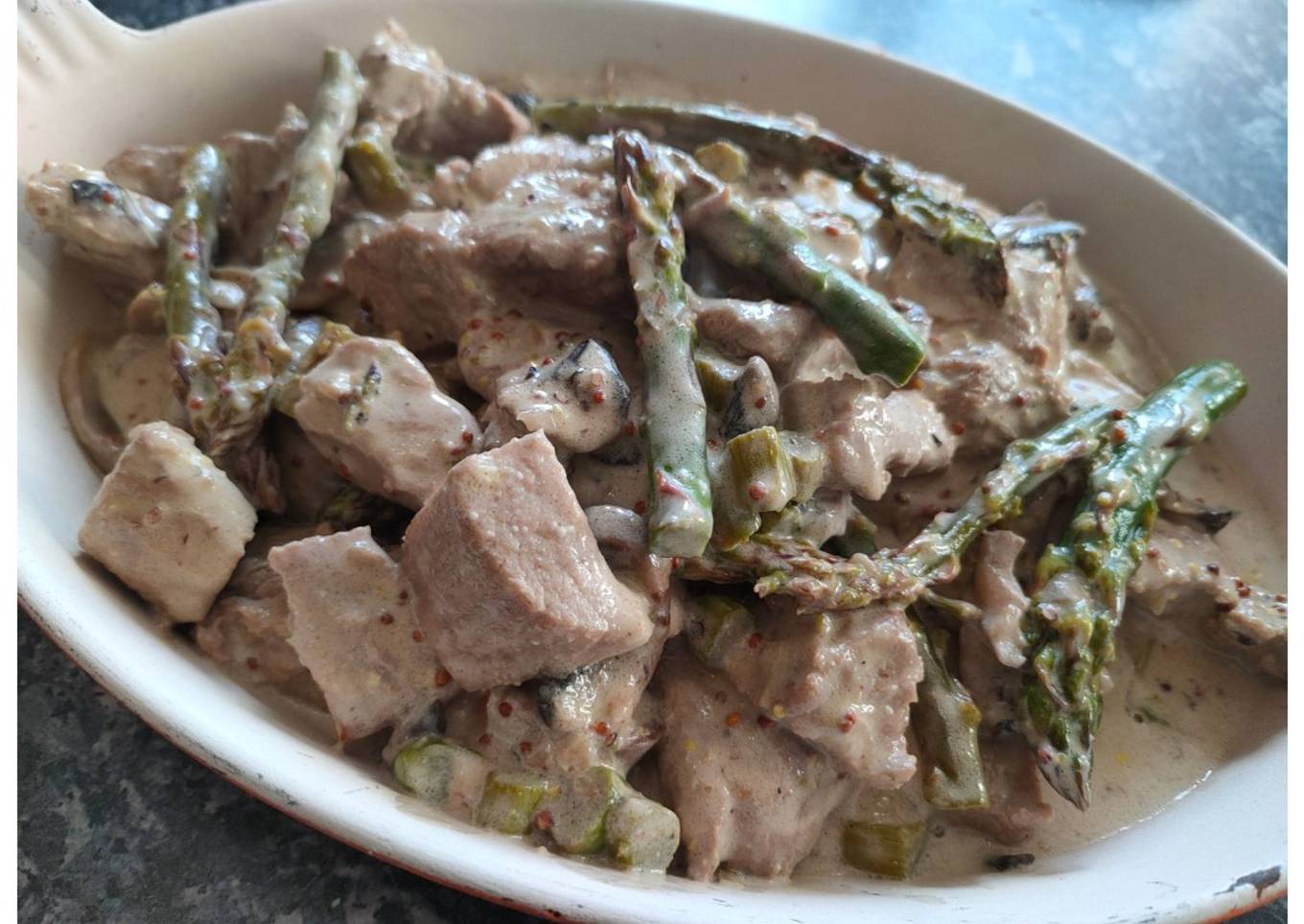 Veau cuisiné à la crème de moutarde, asperges vertes et champignons